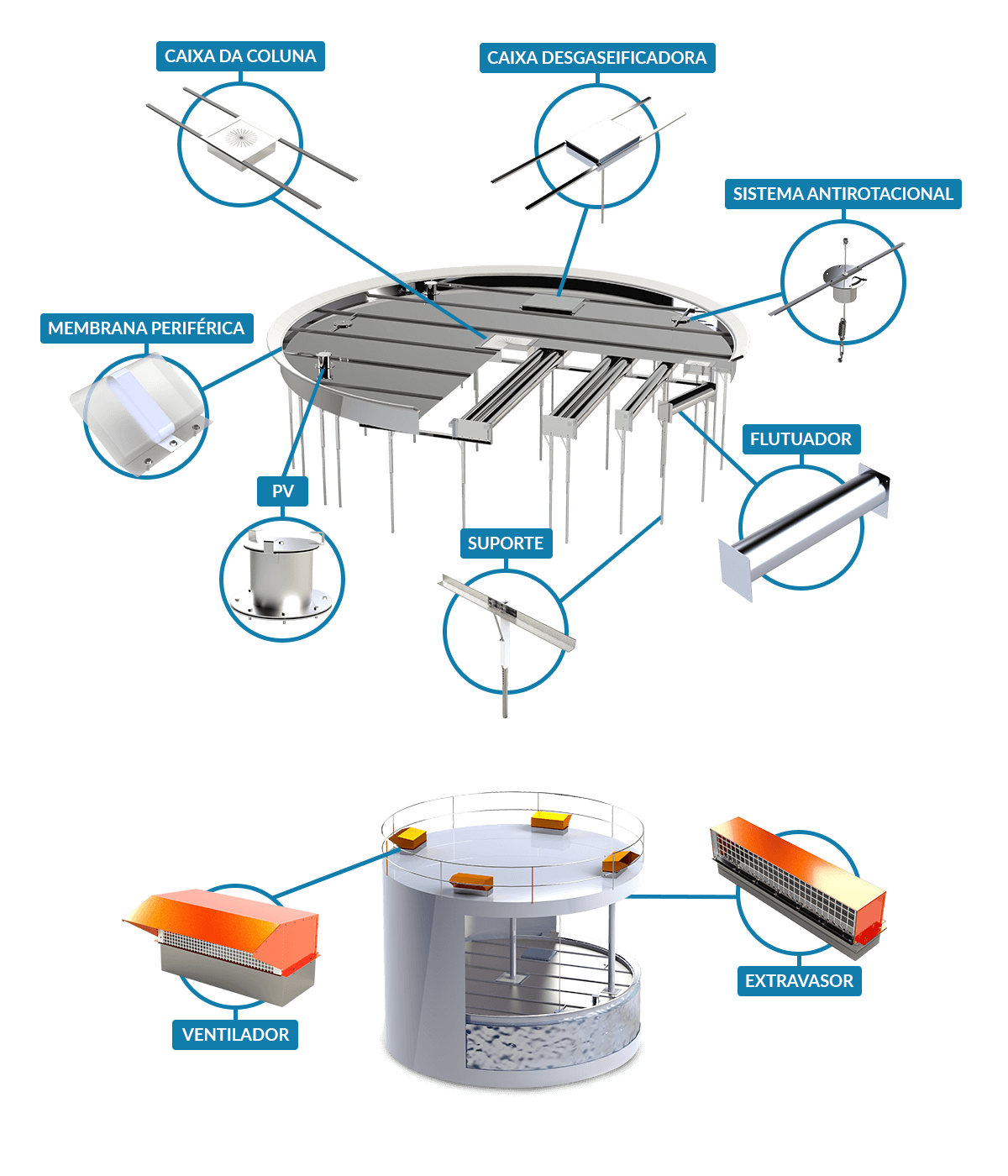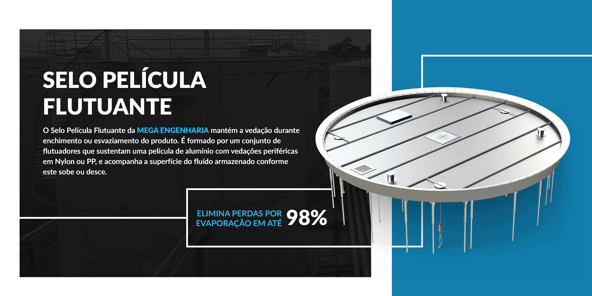 Selo película flutuante da MEGA ENGENHARIA mantém a vedação durante enchimento ou esvaziamento do produto. É formado por um conjunto de flutuadores que sustentam uma película de alumínio com vedações periféricas em Nylon ou PP, e acompanha a superfície do fluido armazenado conforme este sobe ou desce.